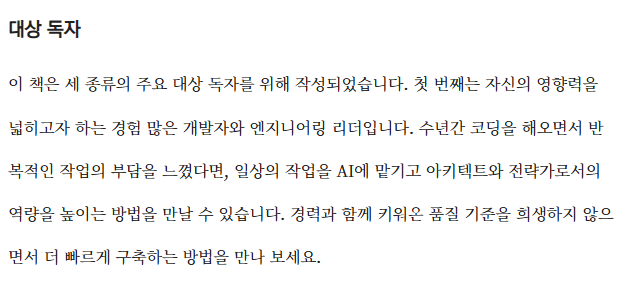'시대의 흐름' 이라고 생각해서 '뭐 먹고 살지' 라고 개발자 말고 다른 일을 찾을 생각만 할 것이 아니라 이런 책을 통해 나는 앞으로 펼쳐질 미래에 어떤 전문성을 갖추고 어떤식으로 활용을 해서 어떻게 필요한 개발자가 될 것인가를 논의하고 실행해야 하는 중요한 시기가 아닐까 싶다.