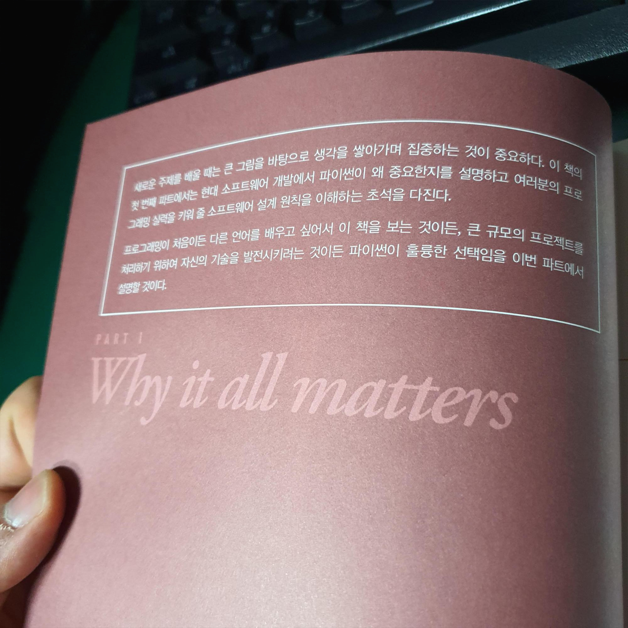 - 파이썬의 우월성에 대한 이야기가 아니라 파이썬은 부수적이고 개발에 관련된 이야기를 멋지게 풀어나감